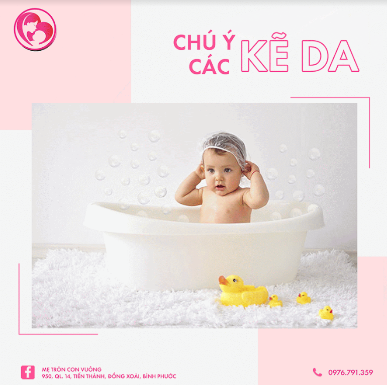các vùng da dưới cánh tay, sau tai, các kẽ quanh cổ và trong khu vực quấn tã cần được chú ý hơn cùng với vệ sinh sạch vị trí giữa các ngón tay và ngón chân của bé, nhất là đối với những trẻ mũm mĩm vì thường có rất nhiều ngấn trên da